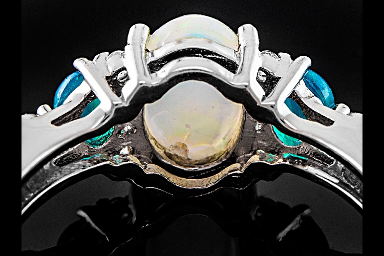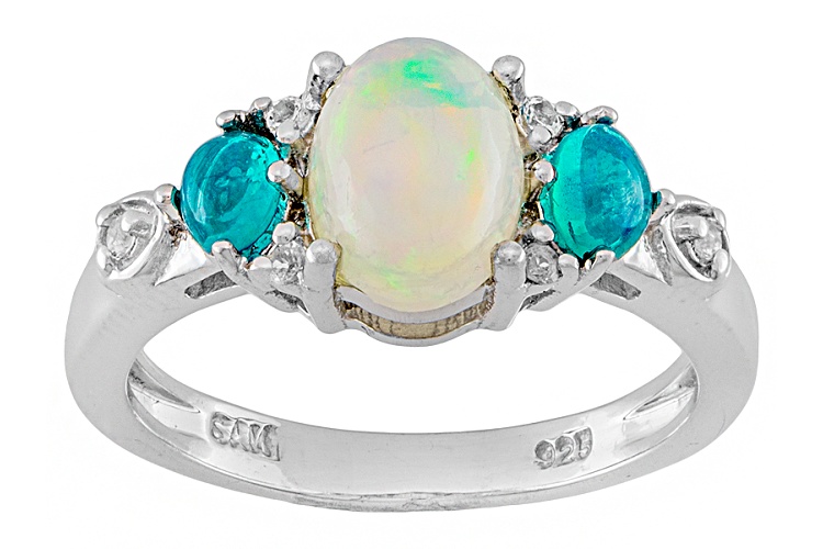.90ct oval cabochon Paraiba Blue Color Opal with .22ctw oval blue Ethiopian opal and .04ctw round white topaz sterling silver ring. Measures approximately 5/16"L x 1/16"W. Not sizeable. Rhodium plated.