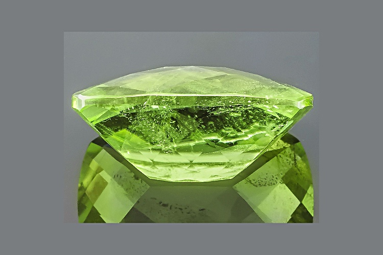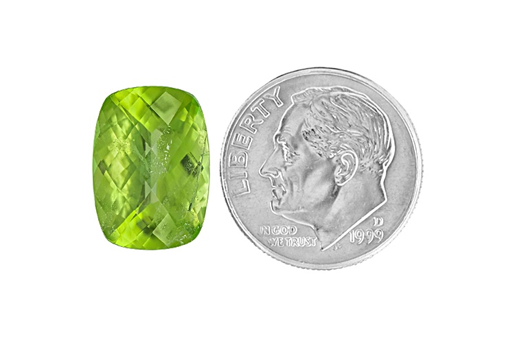Pakistan peridot 7.56ct 14.5x10.5mm rectangular cushion checkerboard cut. Gemstone mined in Pakistan and cut in China.