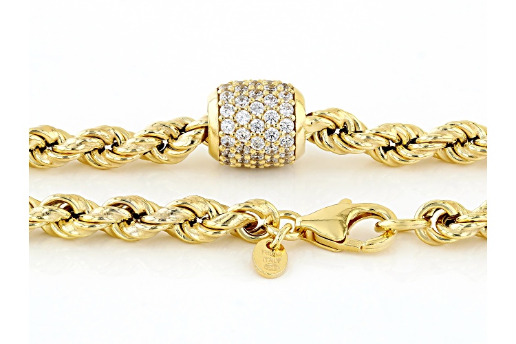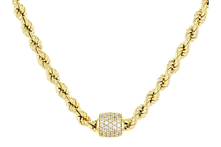 Bella Luce® Italia white diamond simulant 1.50ctw round, Eterno™ 18k yellow gold over sterling silver rope necklace. Measures approximately 20" L x 0.40" W and features a rope chain with a lobster claw clasp closure. The diamond equivalent weight is 0.90ctw.