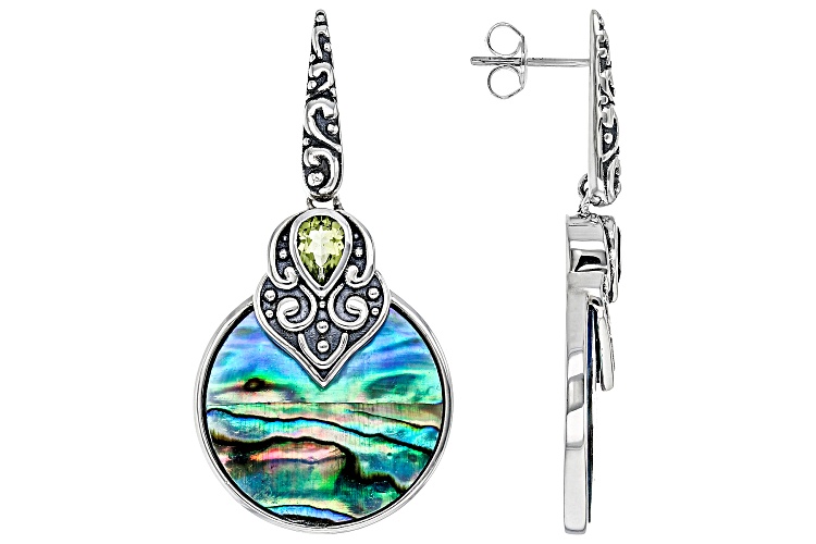 Pacific Style™ 20mm Multi-Color Abalone Shell With 0.77ctw Peridot Sterling Silver Oxidized Earrings