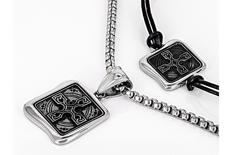 Artisan Collection of Ireland™ Celtic Cross Stainless Steel Pendant with 24" Box Chain & Leather Bracelet Set. Pendant Measures Approximately 1.20"L x 0.75"W. Lobster Claw Clasp. Bracelet Measures Approximately 7.5"L x 0.60"W. Lobster Claw Clasp with 0.75" Extender