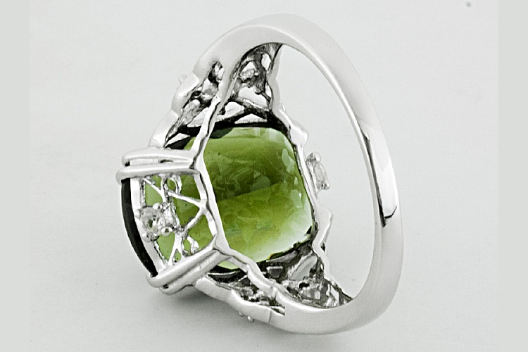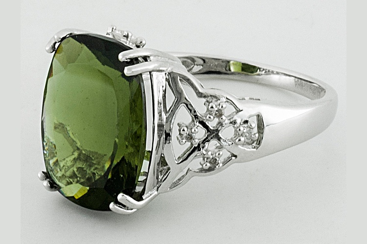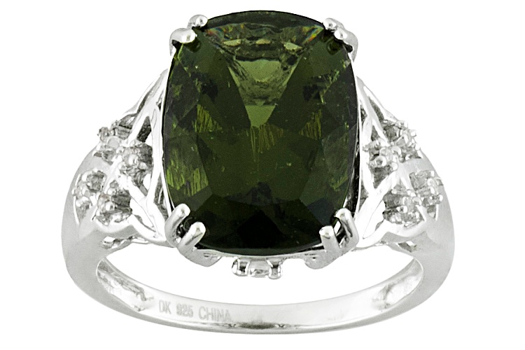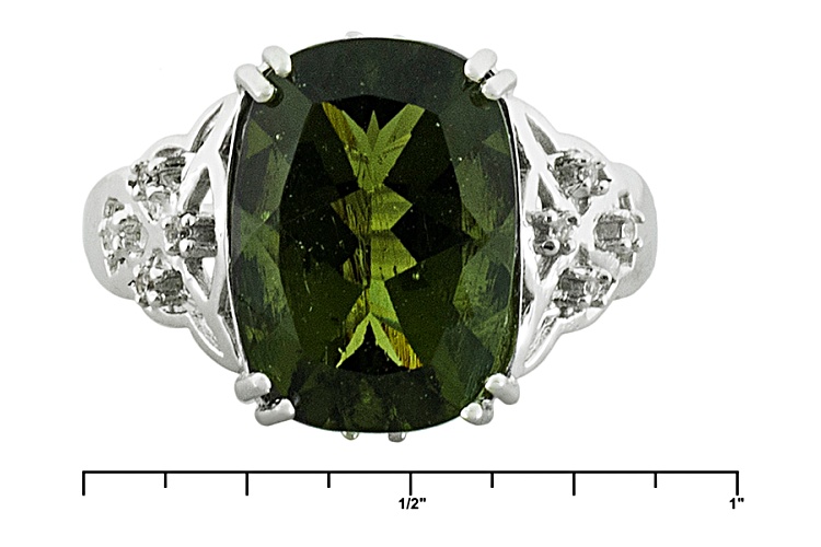 • 4.04ct Rectangular Cushion Moldavite And .09ctw Round White Zircon Rhodium Over Sterling Silver Ring - Size 9