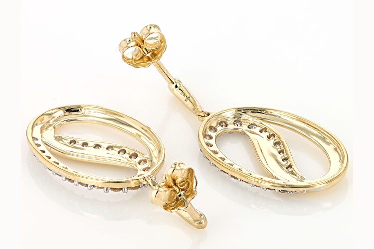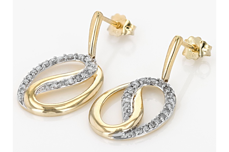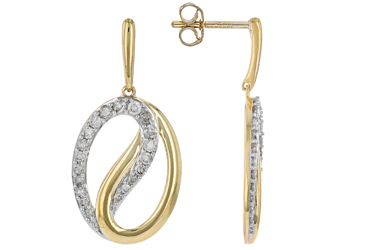 0.50ctw round white diamond, 10k yellow gold dangle earrings. Measure approximately 1 & 1/16"L x 1/2"W and have push back backings. White rhodium enhanced settings.