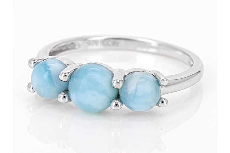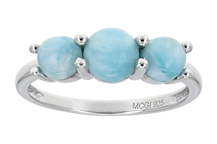 5mm and 6mm Round Blue Larimar Rhodium Over Sterling Silver 3-Stone Ring. Measures Approximately 0.63"L x 0.22"W. Not Sizeable.