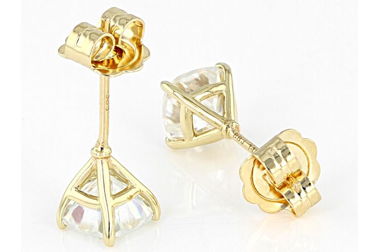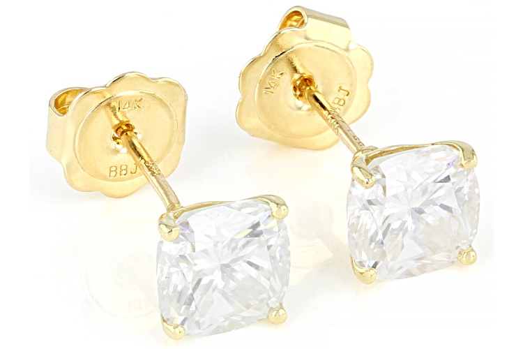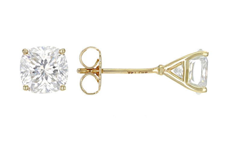 Pre-Owned Moissanite Fire(R) 2.60ctw diamond equivalent weight cushion cut, 14k yellow gold stud earrings. Measures approximately 1/4"L x 1/4"W and have tension post backs. Actual moissanite weight is 2.42ctw. . This product may be a customer return, vendor sample, or on-air display and is not in its originally manufactured condition. It may not be new. In some instances, these items are repackaged by JTV.