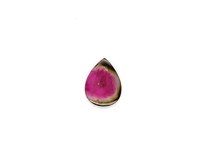 Brazilian watermelon tourmaline free-form slice minimum 7.00ct. Size and shape will vary. Measures approximately 13.5-20mm. The gemstone was mined in Brazil and cut in India.