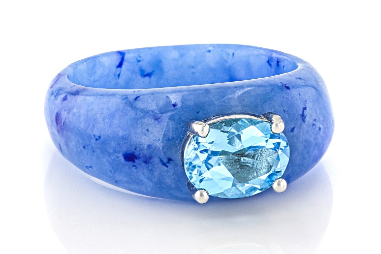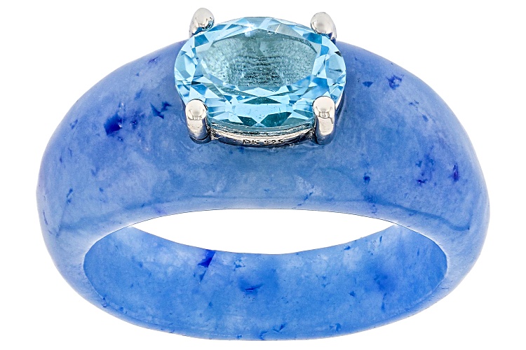 Blue Jadeite with 1.25ct Oval Swiss Blue Topaz Rhodium Over Sterling Silver Ring. Measures Approximately 0.92"L x 0.35"W. Not Sizeable.