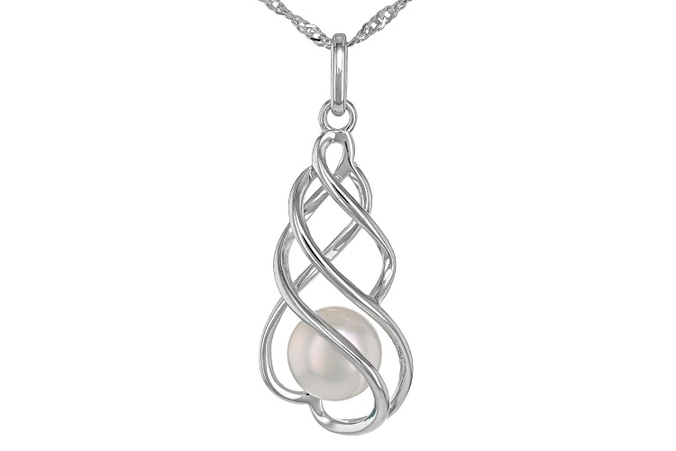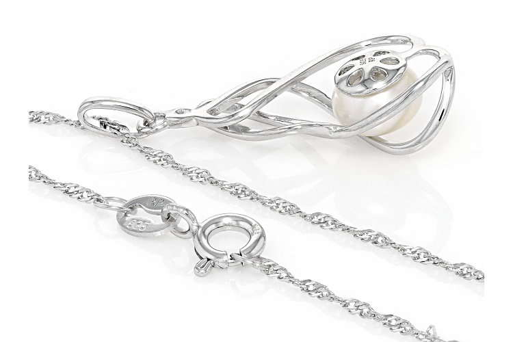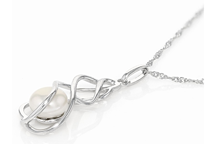 7-8mm White Cultured Freshwater Pearl Rhodium Over Sterling Silver Pendant with Chain