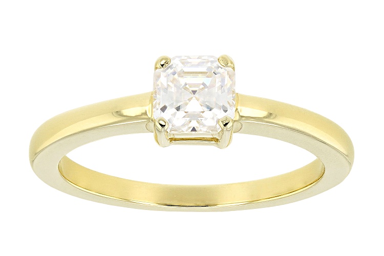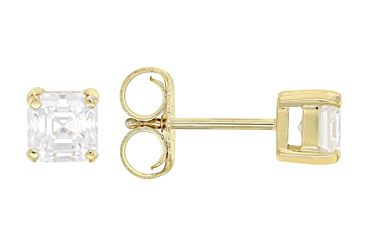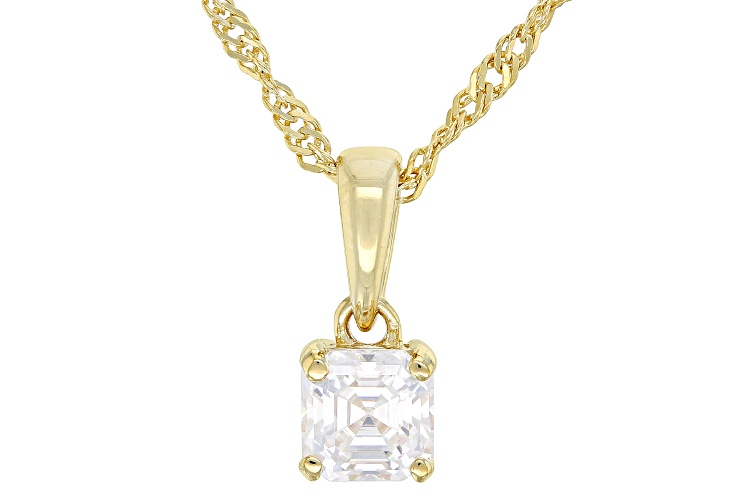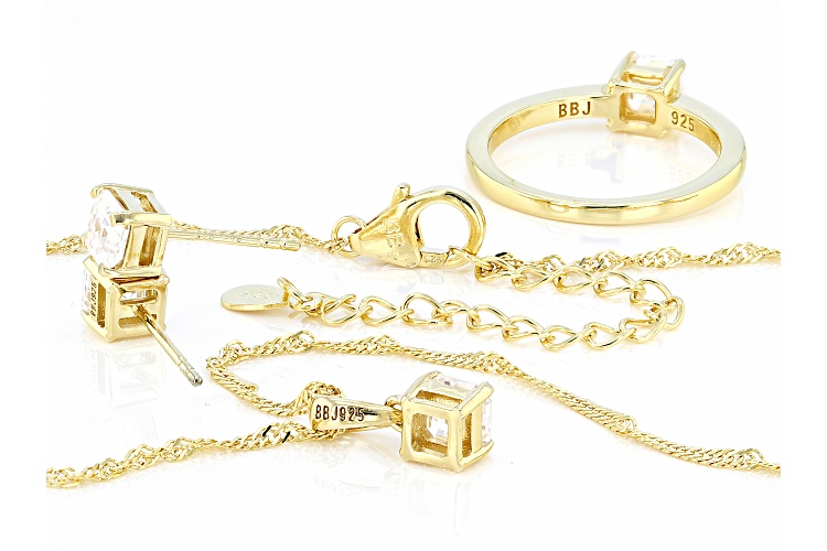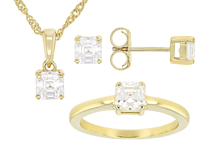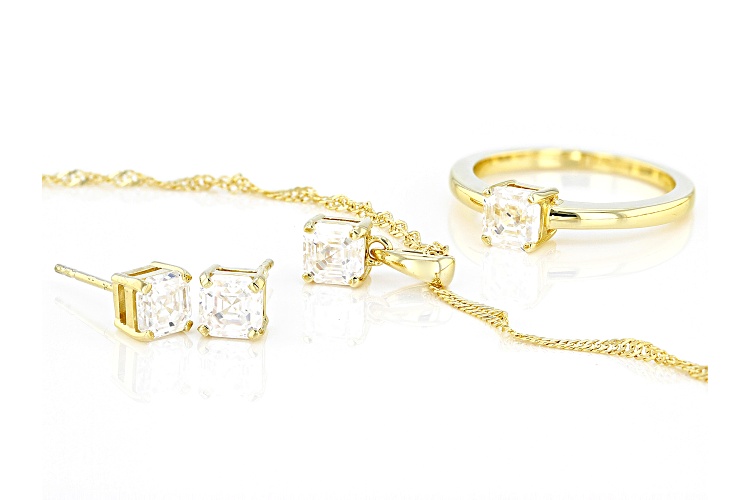 Moissanite Fire® 2.40ctw diamond equivalent weight Asscher cut, 14k yellow gold over sterling silver ring and stud earrings with pendant and 18-inch Singapore chain jewelry set. Ring measures approximately 3/16" L x 1/16" W and is not sizeable. Earrings measures approximately 3/16" L x 3/16" W and have push backs. Pendant measures approximately 1/2" L x 3/16" W and has lobster clasp with 2 inch extender. Actual moissanite weight is 2.08ctw.
