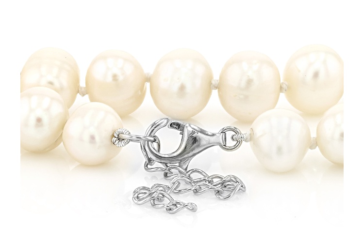 9.5mm White Cultured Freshwater Pearl Rhodium Over Sterling Silver Necklace. Measures approximately 3/8 of an inch in width with a 2 inch extender and a lobster claw clasp. Colors, shapes, and sizes may vary.