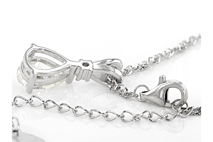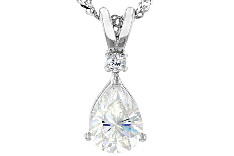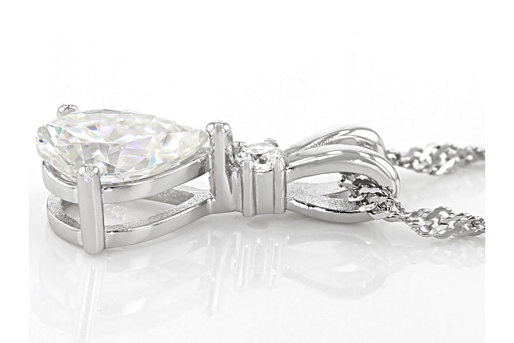 1.95ct pear shape lab created Strontium Titanate and .10ct round white zircon rhodium over sterling silver pendant and 18-inch Singapore chain with 2-inch extender. Measures approximately .63"L x .25"W and has a lobster clasp. Accent stones primarily zircon.