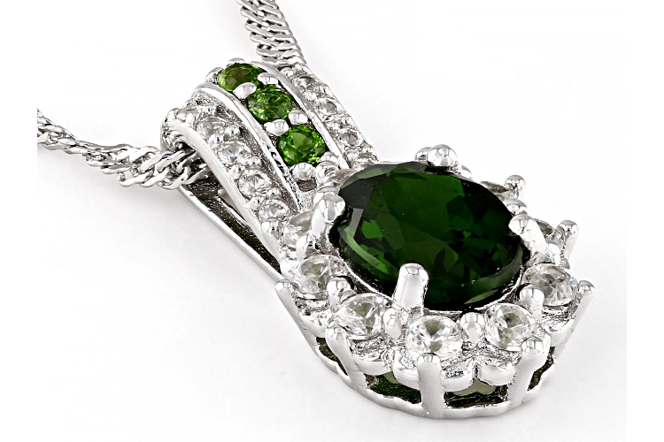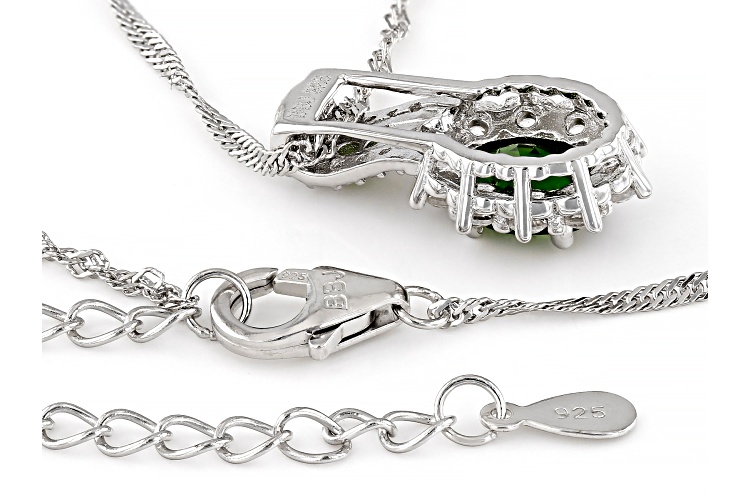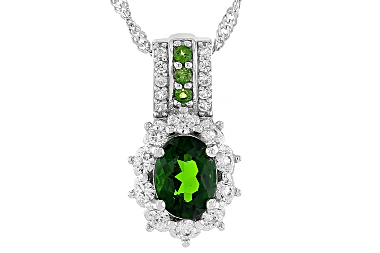 1.03ct Oval And 0.07ctw Round Chrome Diopside With .54ctw Round White Zircon Platinum Over Sterling Silver Pendant With 18"Singapore Chain. Measures Approximately 0.80"L x 0.43"W. 3mm bail. Lobster clasp with 2"extender. Accents stone primarily zircon.