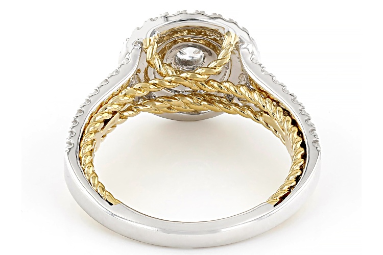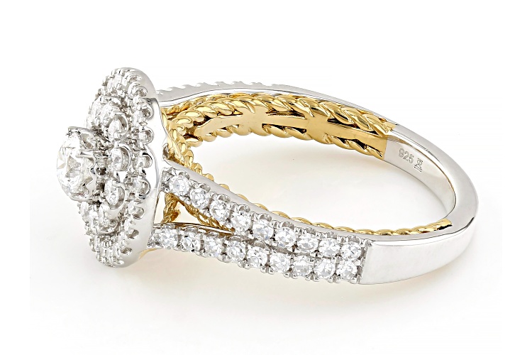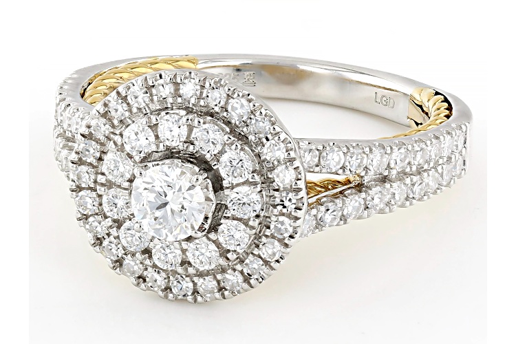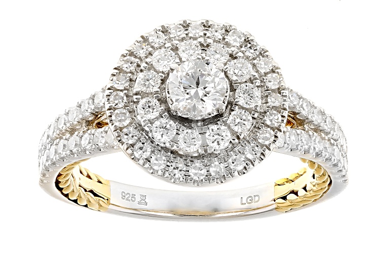 Prazana® Lab-Grown Diamonds 0.26ct round white lab-grown diamond center stone surrounded by 0.74ctw round white lab-grown diamond, rhodium over sterling silver with accents of 14k yellow gold over sterling silver halo ring. Measures approximately 7/16"L x 7/16"W and is not sizeable. G color, SI clarity minimum.