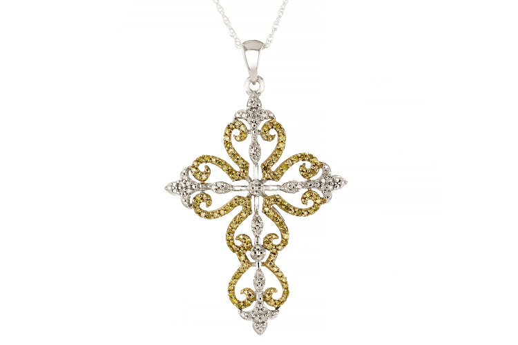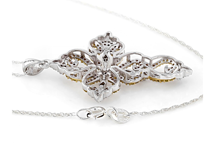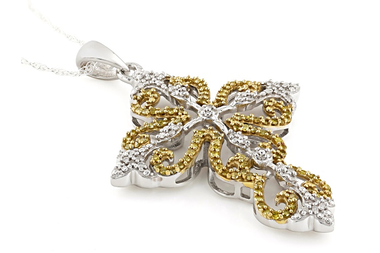 0.50ctw round yellow and white diamond, rhodium over sterling silver cross pendant. Suspends from an 18 inch rope chain with a spring ring clasp. Measures approximately 1 & 1/2"L x 1 & 1/16"W and has a 3mm bail. White rhodium enhanced prongs around the white diamonds.