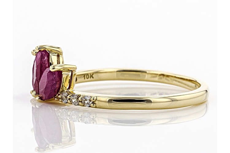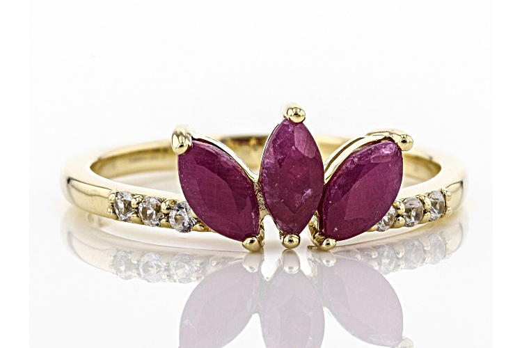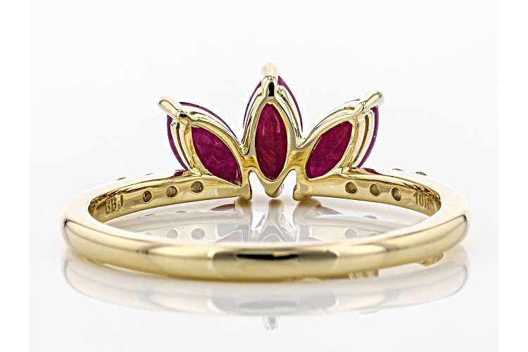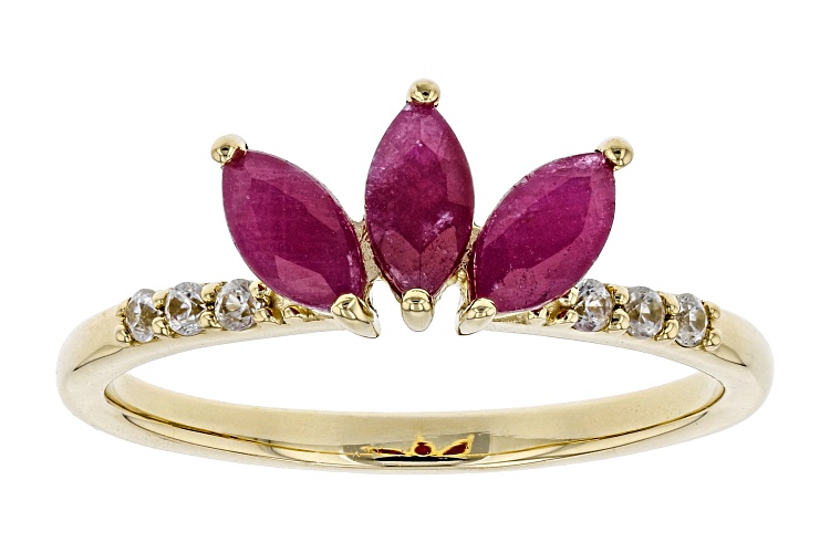 .76ctw Marquise Ruby and .10ctw Round White Zircon 10k Yellow Gold 3-Stone Ring - Size 7