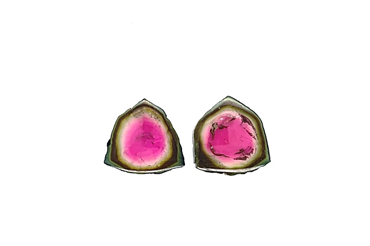 Set of 2 Brazilian watermelon tourmaline 17mm free-form slice 17.34ctw. The gemstones were mined in Brazil and cut in India.