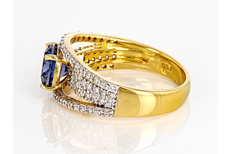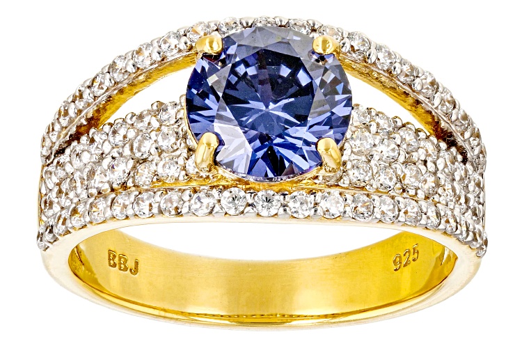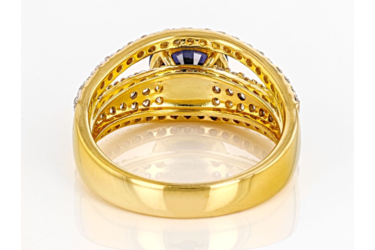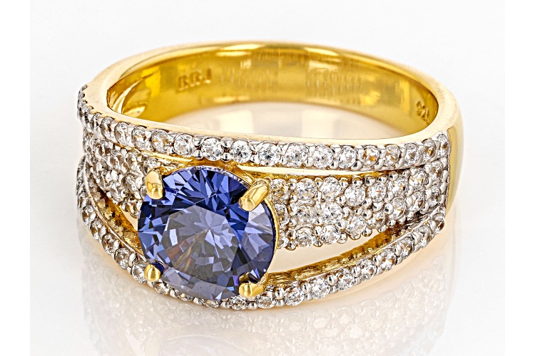 Pre-Owned Bella Luce® Esotica™ tanzanite and white diamond simulants 4.01ctw round, Eterno™ 18k yellow gold over sterling silver ring. Measures approximately 0.88"L x 0.44"W and is not sizeable.. This product may be a customer return, vendor sample, or on-air display and is not in its originally manufactured condition. It may not be new. In some instances, these items are repackaged by JTV.