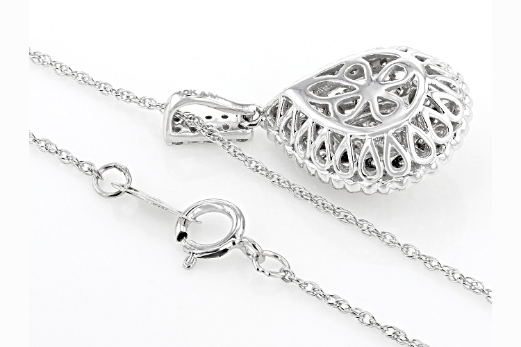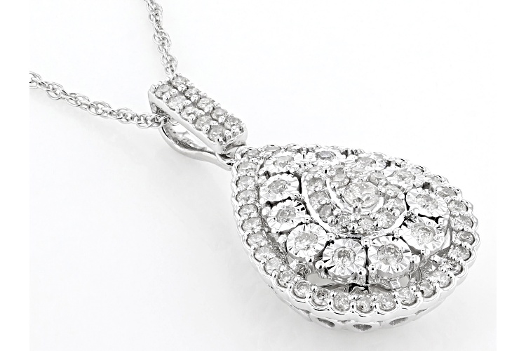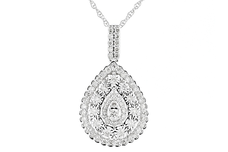 Pre-Owned 0.45ctw round white diamond, rhodium over 10k white gold cluster teardrop pendant with an 18" rope chain and a spring ring clasp. Measures approximately 15/16"L x 1/2"W and has a 2.00mm bail. . This product may be a customer return, vendor sample, or on-air display and is not in its originally manufactured condition. It may not be new. In some instances, these items are repackaged by JTV.