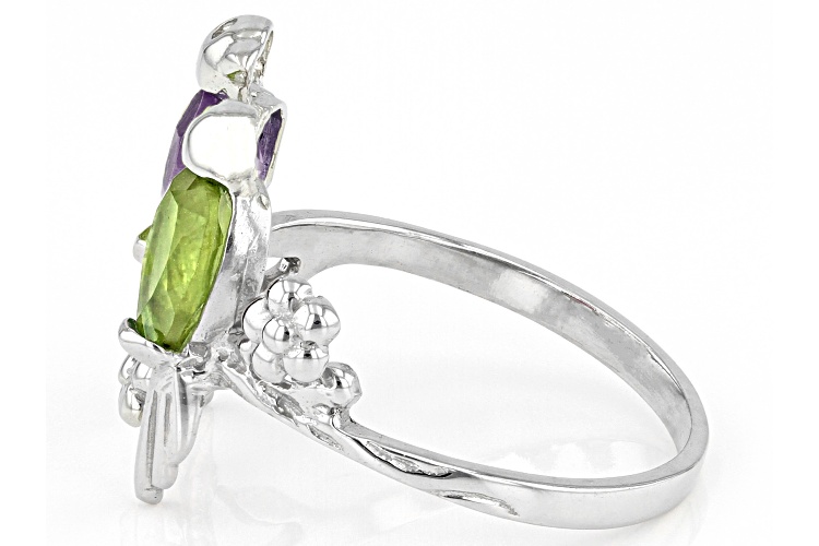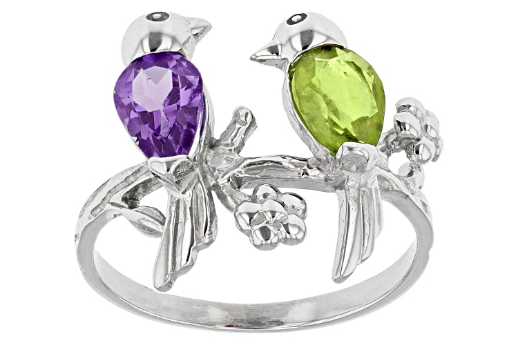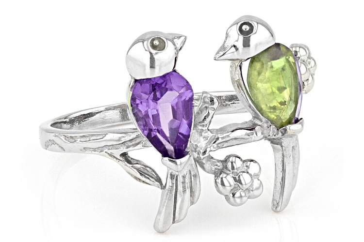 0.45ct Amethyst And 0.45ctw Manchurian Peridot™ Rhodium Over Sterling Silver "Love Birds" Ring - Size 10