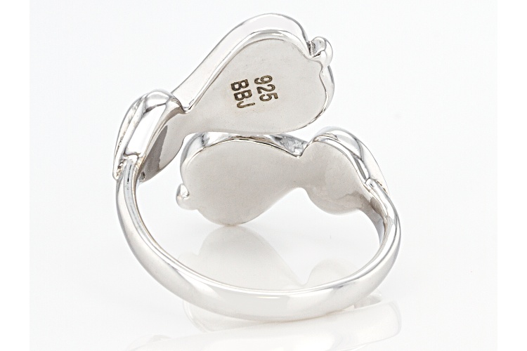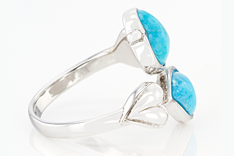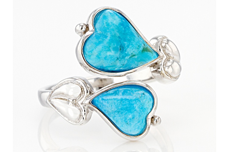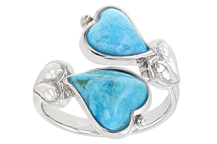 10x8mm and 8x6.5mm Fancy Heart Shape Cabochon Composite Turquoise Rhodium Over Sterling Silver Bypass Ring. Measures approximately .80"L x .73"W. Not sizeable. This product contains composite turquoise. This means separate pieces of turquoise were bound together.
