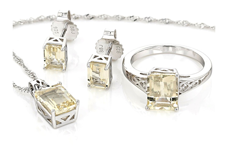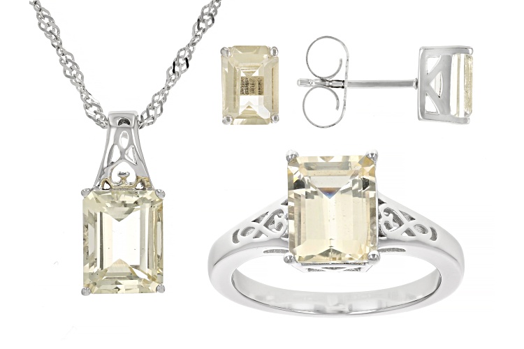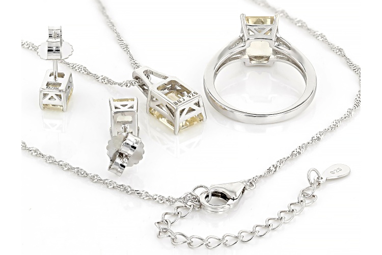 6.95ctw Rectangular Octagonal Yellow Labradorite Rhodium Over Sterling Silver Ring,Earrings, Pendant With 18"Singapore Chain. Ring Measures Approximately 0.31"L x 0.39"W. Not sizeable. Earrings Measures Approximately 0.28"L x 0.20"W. Push Backings. Pendant Measures Approximately 0.62"L x 0.28"W. 3mm bail. Lobster clasp with 2"extender.