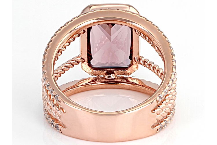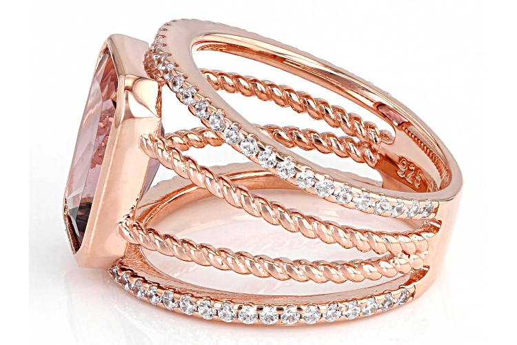 Bella Luce® 4.12ctw 12x8mm Rectangular Cushion Esotica® Blush Zircon Simulant round White Diamond Simulants Eterno® 18k Rose Gold Over Sterling Silver Ring. Measures Approximately 0.84"L x 0.62"W, Shank 0.25"W. Not Sizable
