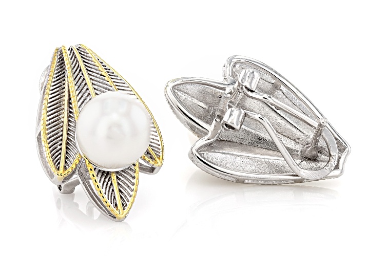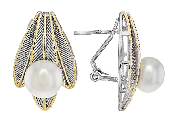 • 8.5mm White Cultured Freshwater Pearl 18k Yellow Gold & Rhodium Over Silver Two-Tone Earrings