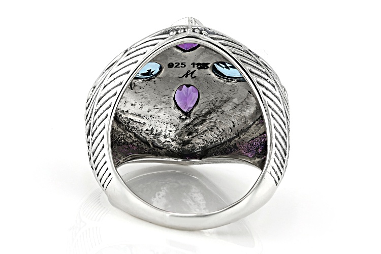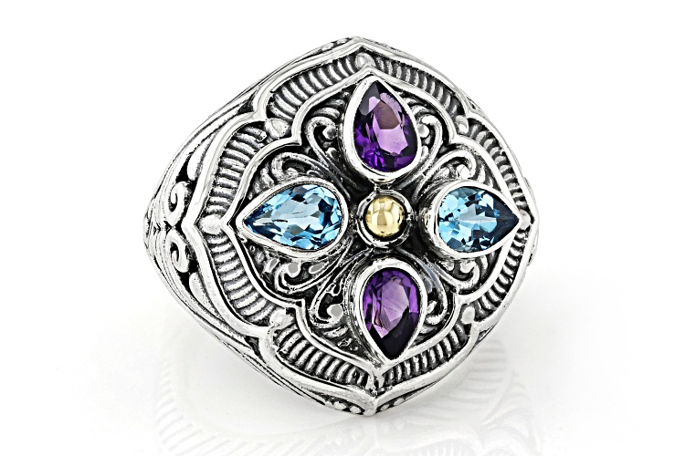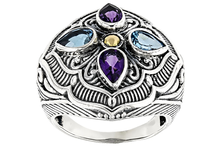 Pre-Owned Artisan Collection of Bali™ Amethyst & Swiss Blue Topaz Sterling Silver & 18K Gold Accent - Size 7
