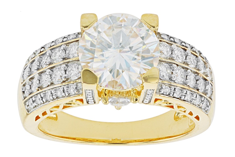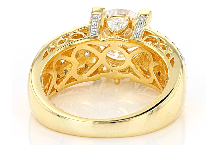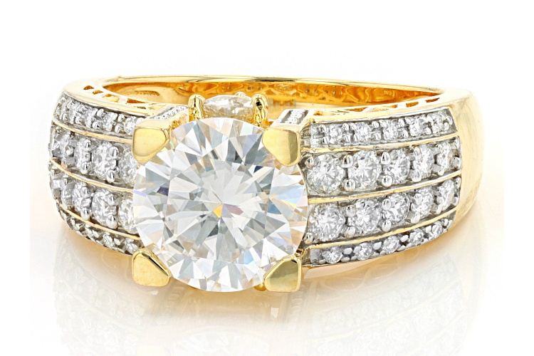 Pre-Owned Moissanite Fire(R) 3.64ctw diamond equivalent weight round and trillion cut, 14k yellow gold over sterling silver ring. Measures approximately 3/8" L x 1/16" W and is not sizeable. White rhodium settings. Actual moissanite weight is 3.06ctw. . This product may be a customer return, vendor sample, or on-air display and is not in its originally manufactured condition. It may not be new. In some instances, these items are repackaged by JTV.