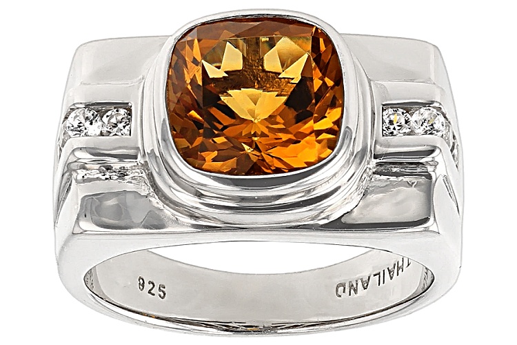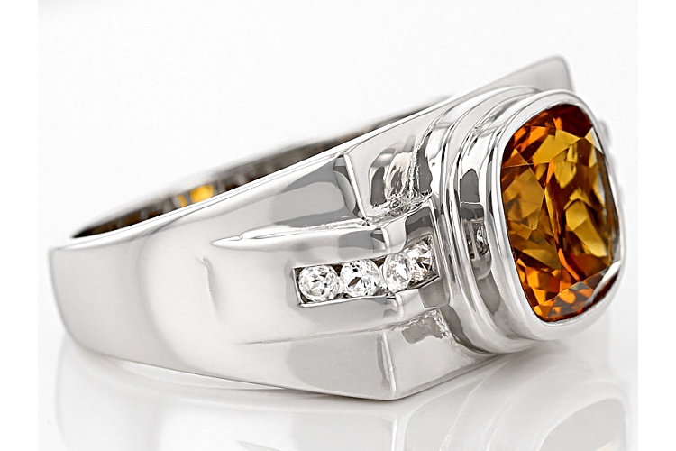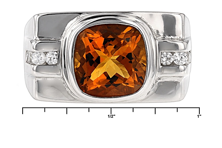 3.51ct 10mm square cushion citrine and .40ctw round white zircon rhodium over sterling silver men's ring. Measures approximately 1/2"L x 1/8"W. Finished under gallery. Not sizeable. Accent stones primarily zircon.