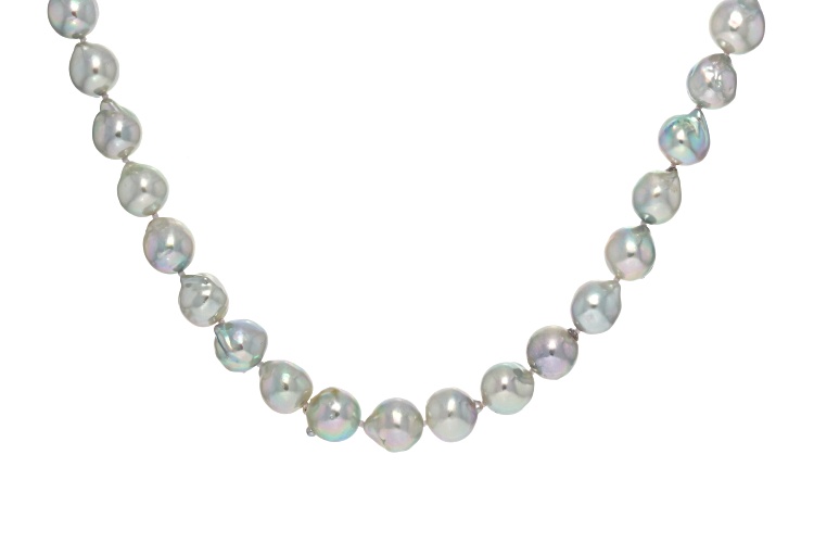9mm Platinum Cultured Japanese Akoya Pearl Sterling Silver 18 Inch Strand Necklace. Measures approximately 5/16 of an inch in width and has a fishhook clasp. Colors, shapes, and sizes may vary.