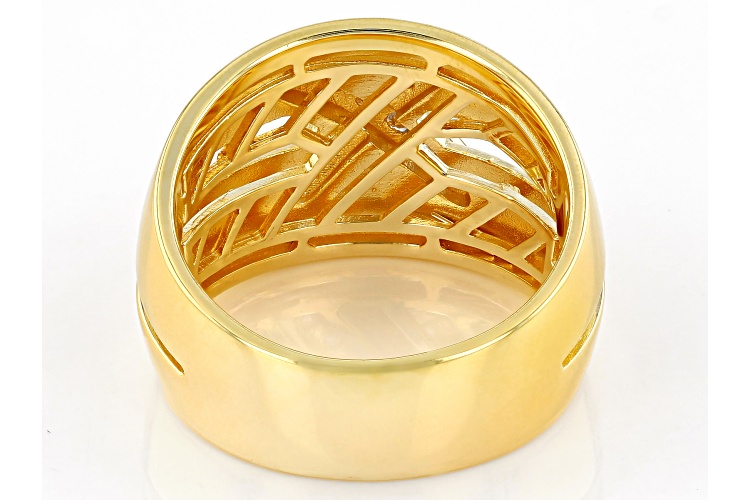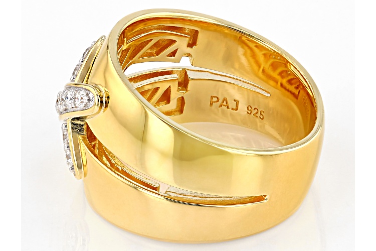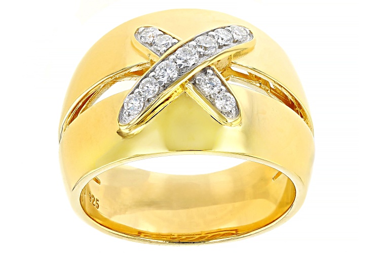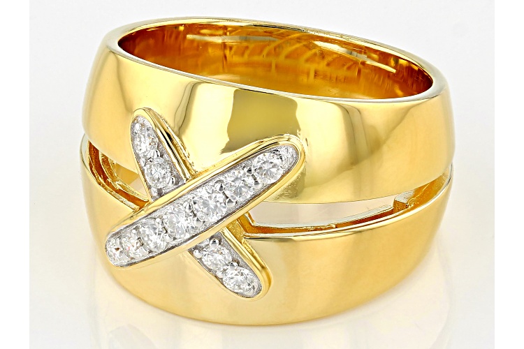 Pre-Owned Moissanite Fire® .25ctw diamond equivalent weight round brilliant, 14k yellow gold over sterling silver ring. Platineve settings. Measures approximately 9/16" L x 1/4" W and is not sizeable. Actual moissanite weight is .25ctw.. This product may be a customer return, vendor sample, or on-air display and is not in its originally manufactured condition. It may not be new. In some instances, these items are repackaged by JTV.