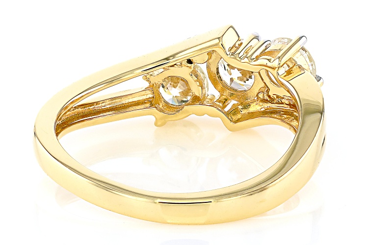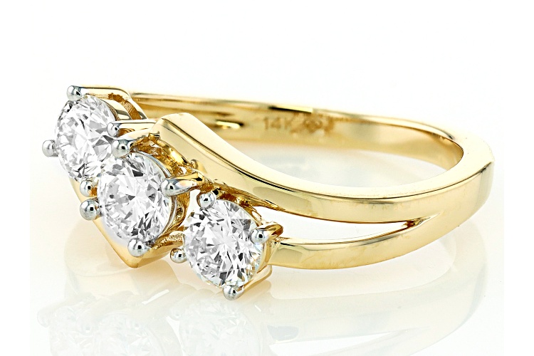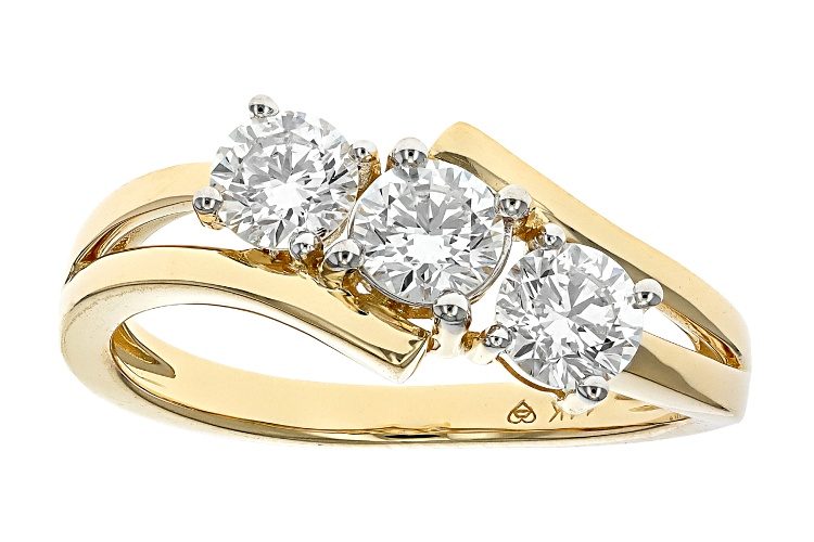 Prazana® Lab-Grown Diamonds 1.00ctw round white lab-grown diamond, 14k yellow gold 3-stone ring. Measures approximately 1/2"L x 5/16"W and is sizeable. Rhodium enhanced prongs. G-H color, VS clarity minimum.