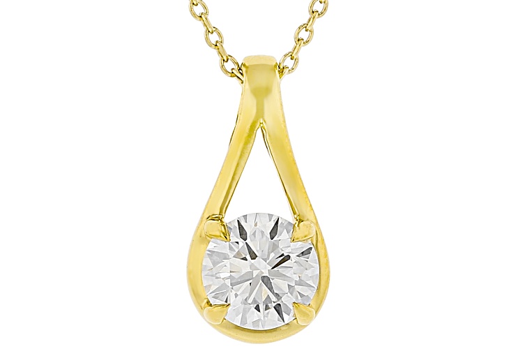 Prazana® Lab-Grown Diamonds 0.75ct round white lab-grown diamond, 14k yellow gold over sterling silver solitaire pendant. Suspends from an 18 inch cable chain with a spring ring clasp closure. Measures approximately 9/16"L x 1/4"W and has a 1.50mm bail. H color, SI clarity minimum.