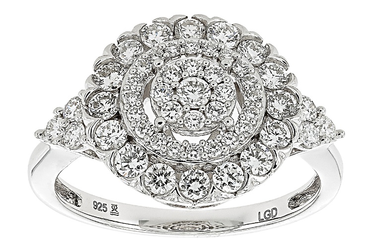 Prazana® Lab-Grown Diamonds 1.00ctw round white lab-grown diamond, rhodium over sterling silver halo ring. Measures approximately 9/16"L x 9/16"W and is not sizeable. H color, SI clarity minimum.