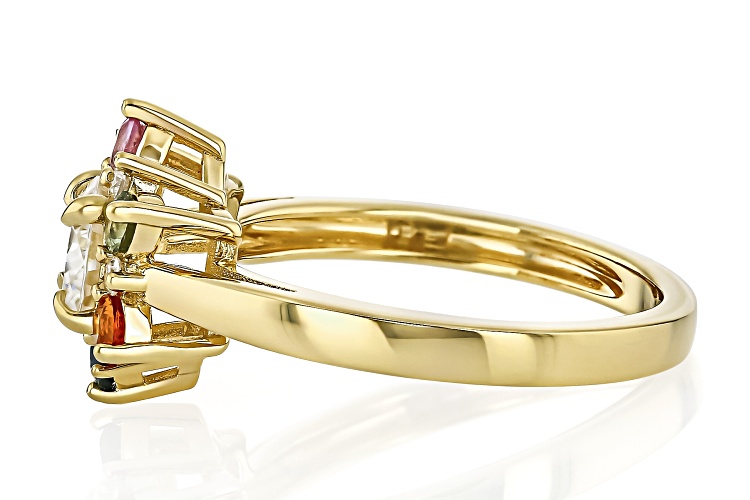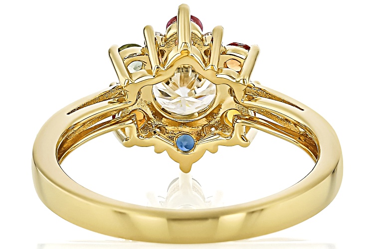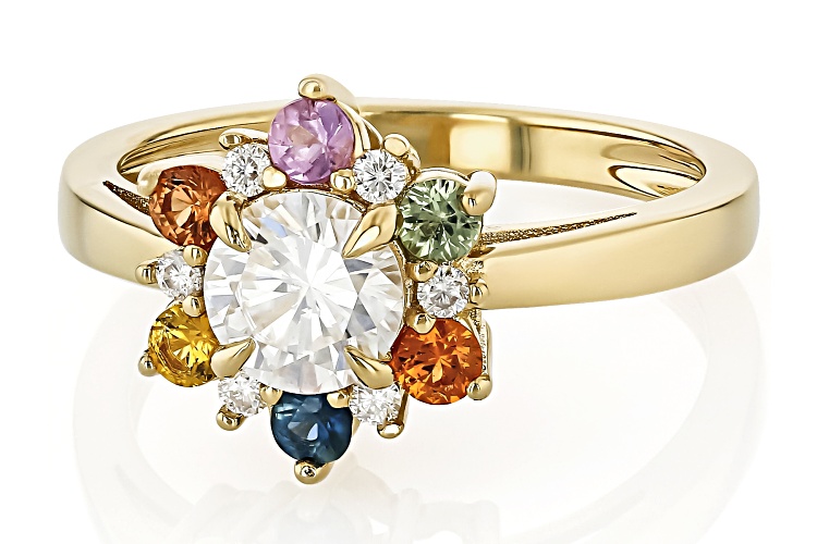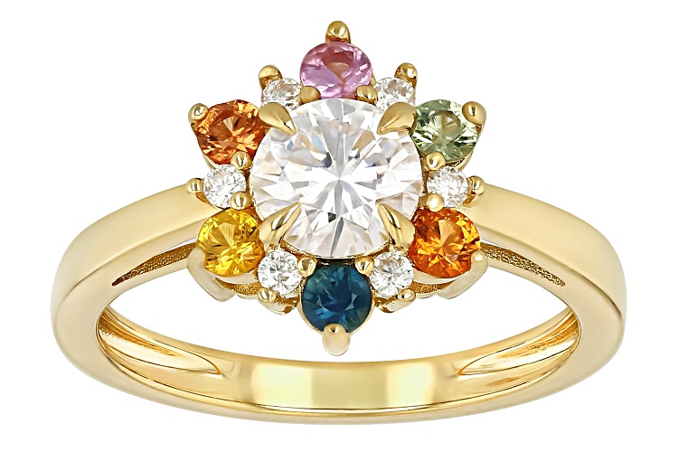 Moissanite Fire® .92ctw diamond equivalent weight round brilliant and .54ctw round multi color sapphire, 14k yellow gold over sterling silver ring. Measures approximately 3/8" L x 7/16" W and is not sizeable. Actual moissanite weight is .74ctw.