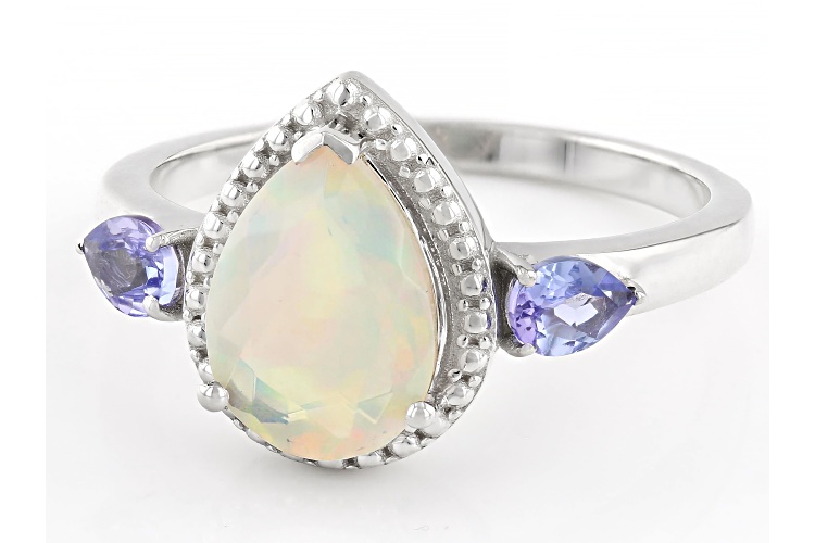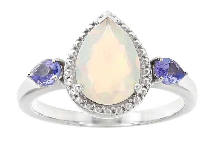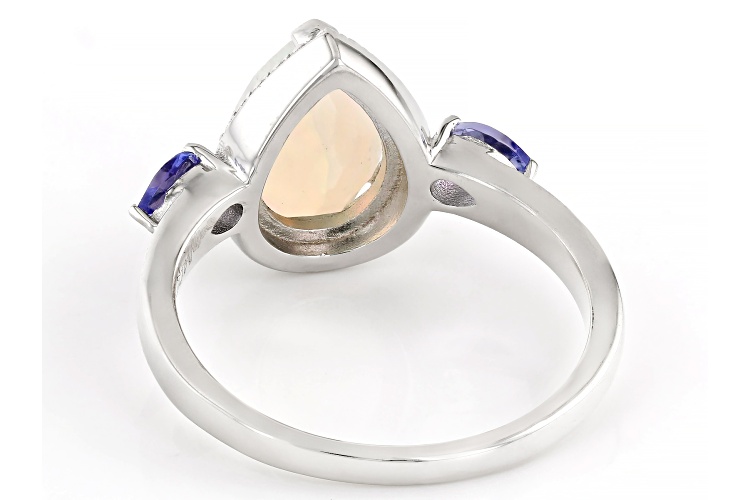 0.90ct Pear Shape Ethiopian Opal With 0.30ctw Pear Shape Tanzanite Platinum Over Sterling Silver Ring. Measures Approximately 0.70"L x 0.48"W. Not Sizeable.