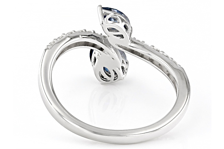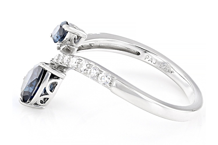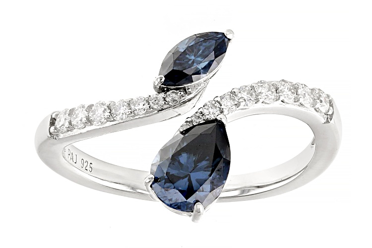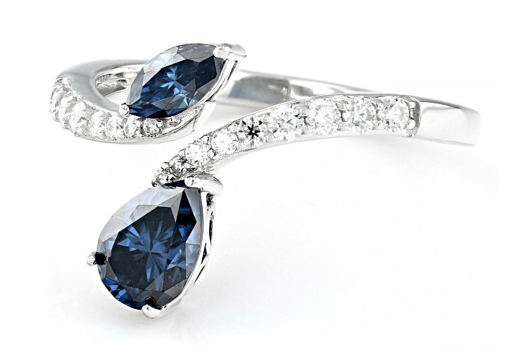 Moissanite Fire® and navy blue moissanite 1.34ctw diamond equivalent weight pear shape and marquise cut, with round brilliant, Platineve® bypass ring. Measures approximately 7/16 " L x 1/16" W and is not sizeable. Actual moissanite weight is 1.13ctw.