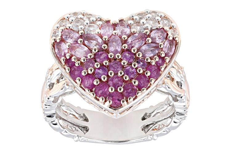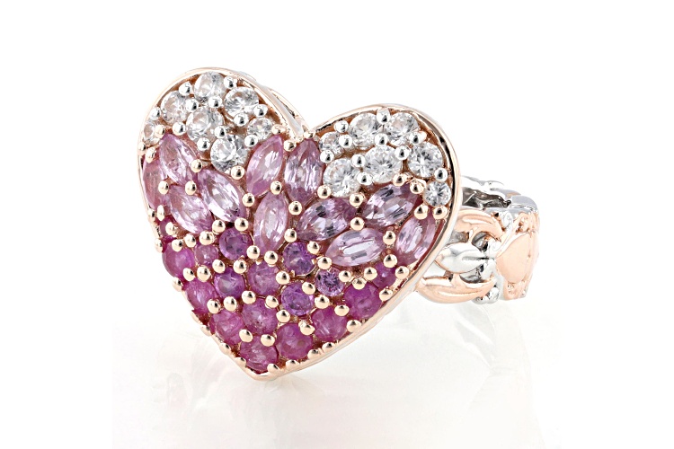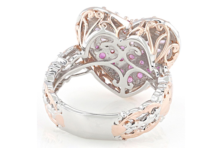 Gems En Vogue 0.99ctw Marquise And 0.30ctw Round Pink Sapphire With 0.48ctw Round Ruby And 0.79ctw Round White Zircon Rhodium And 18k Rose Gold Over Palladium Sterling Silver Two-Tone Heart Ring. Measures Approximately 0.75"L x 0.65"W. Not Sizeable.