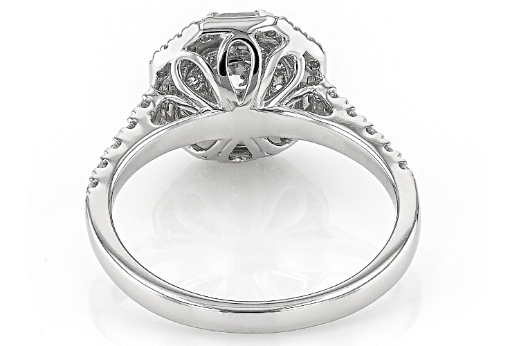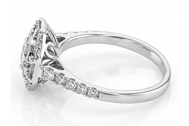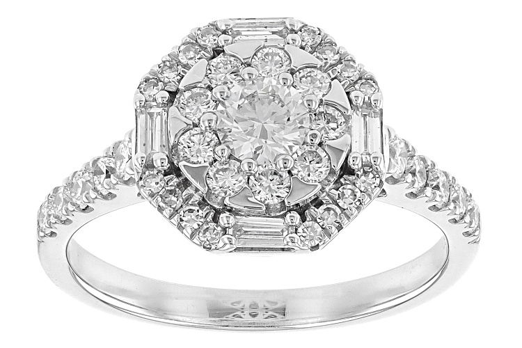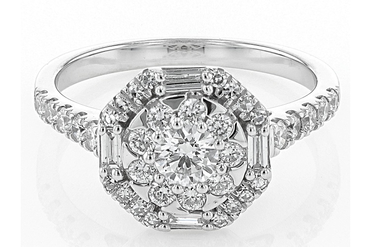Prazana® Lab-Grown Diamonds 0.25ct round white lab-grown diamond center stone surrounded by 0.75ctw round and baguette lab-grown diamond, rhodium over sterling silver halo ring. Measures approximately 7/16"L x 7/16"W and is not sizeable. H color, SI clarity minimum.