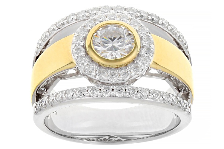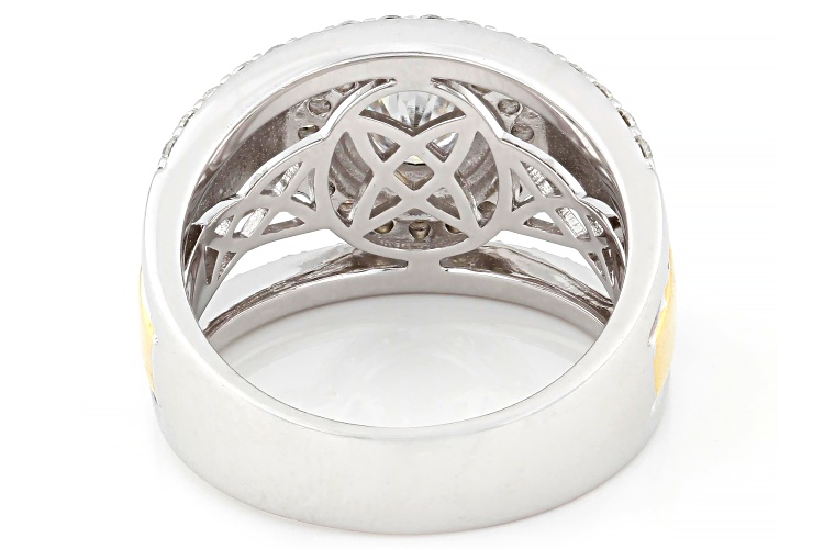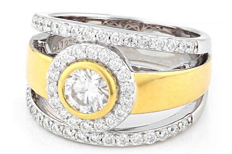 Moissanite Fire® 1.60ctw diamond equivalent weight round brilliant, Platineve® and 14k yellow gold over sterling silver ring. Measures approximately 3/4" L x 9/16" W and is not sizeable. Actual moissanite weight is 1.04ctw.