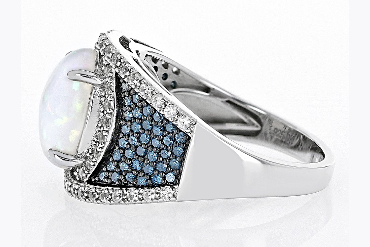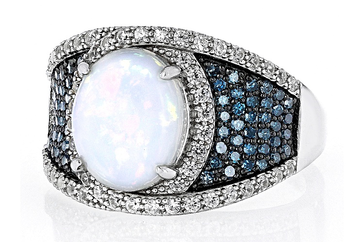 2.00ct Oval Ethiopian Opal with 0.42ctw Round Blue Diamond And 0.26ctw Round White Zircon Rhodium Over Sterling Silver Ring. Measures Approximately 0.74"L x 0.46"W. Not Sizeable. Accent stones primarily zircon. Finished Undergallery.