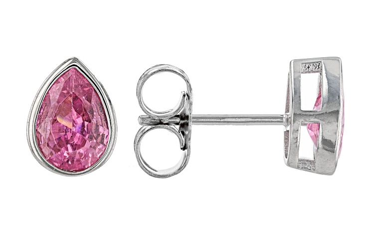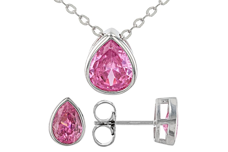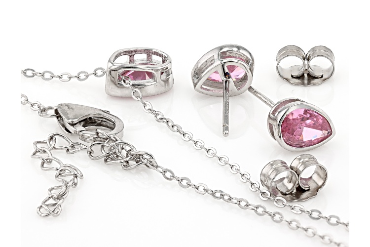 Bella Luce® pink diamond simulant 3.87ctw pear, rhodium over sterling silver jewelry set. Necklace drop measures approximately 0.37" L x 0.27" W. Cable chain measures 16" L x 0.03" W and has a lobster claw clasp closure. The earrings measure approximately 0.32" L x 0.23" W and has push back backings. The diamond equivalent weight is 2.34ctw.