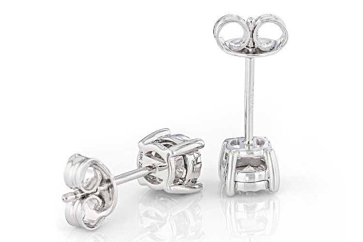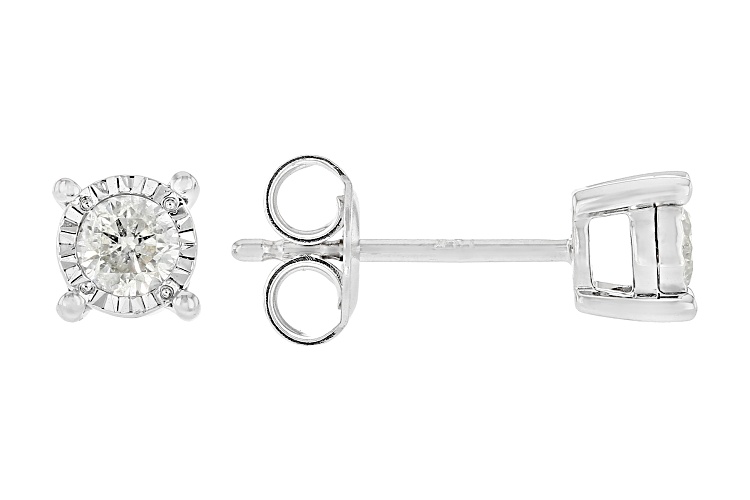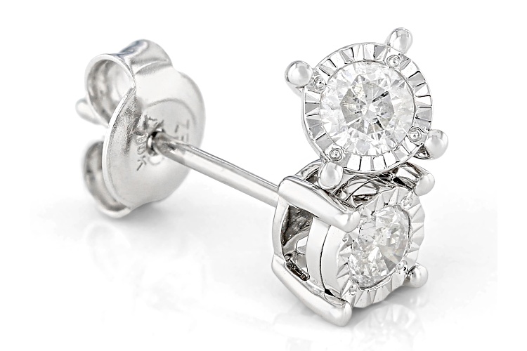 0.25ctw round white diamond, rhodium over 10k white gold solitaire stud earrings. Measure approximately 1/8"L x 1/8"W and have push back backings.