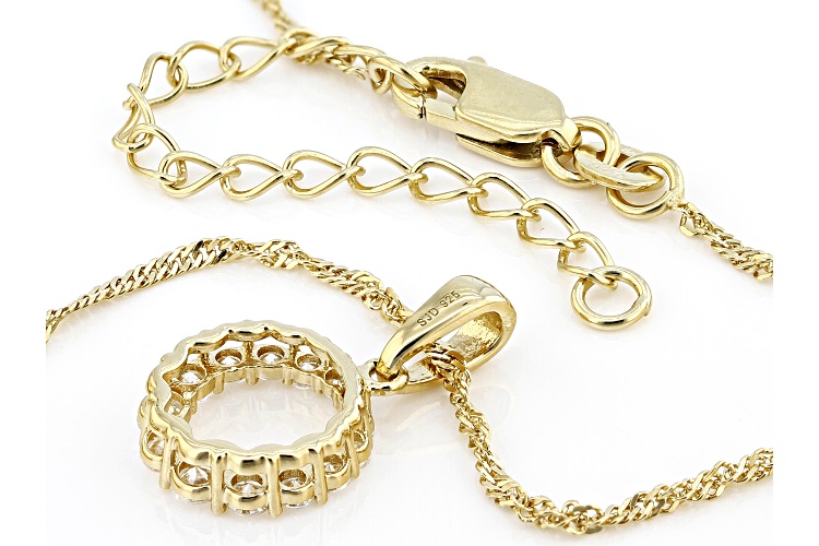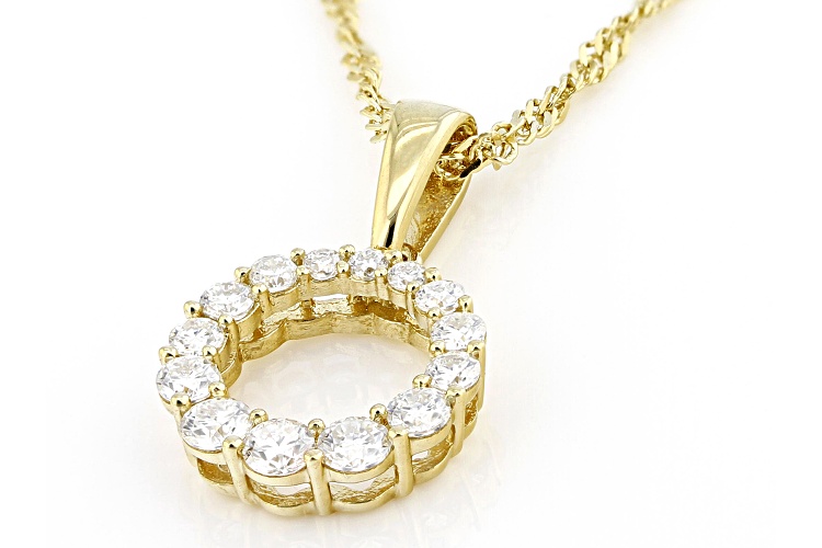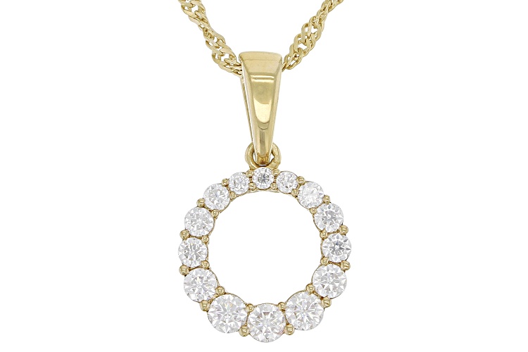 Moissanite Fire® .45ctw diamond equivalent weight round, 14k yellow gold over sterling silver circle pendant with 18 inch Singapore chain. Measures approximately 3/4" L x 7/16" W and has a lobster clasp and two inch extender. Actual moissanite weight is .38ctw. .