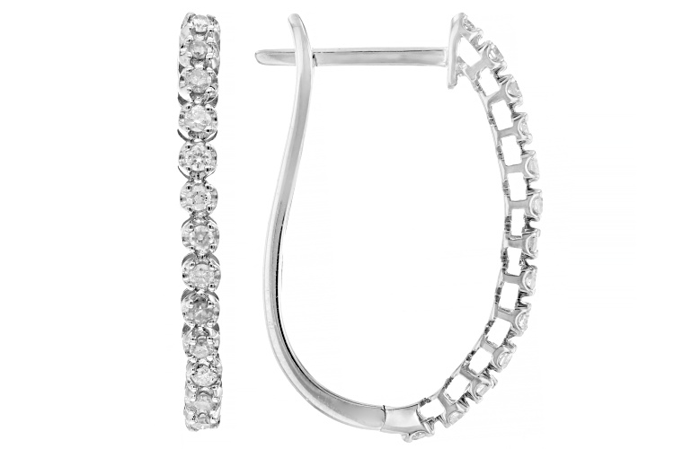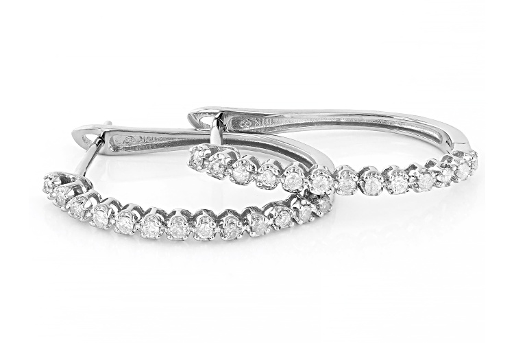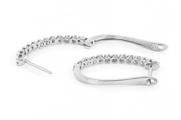 0.25ctw round white diamond, rhodium over 10k white gold hoop earrings. Measure approximately 15/16"L x 1/16"W and have hinge with notch post backings.