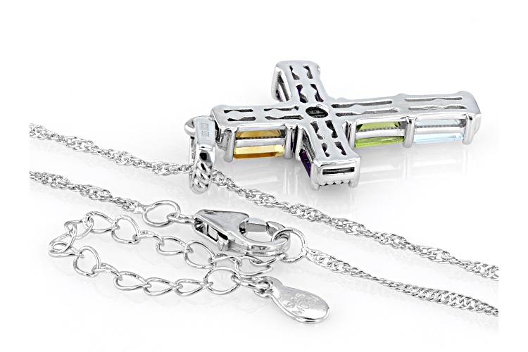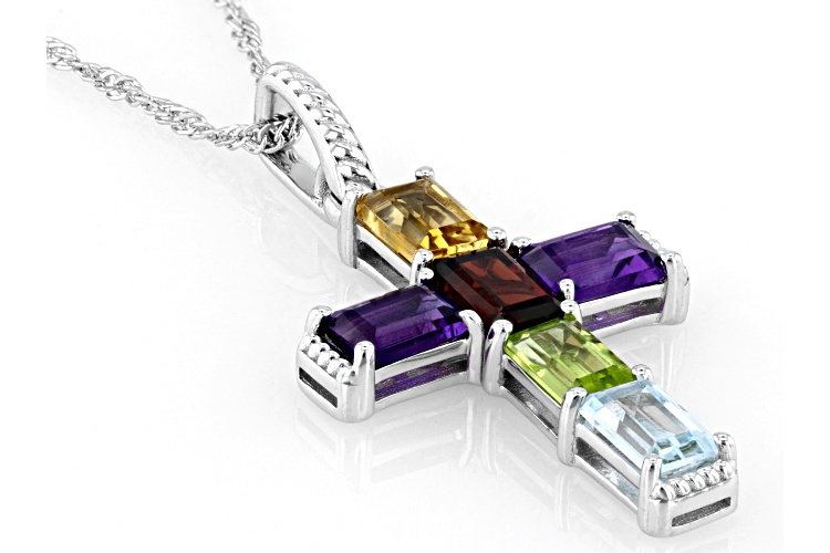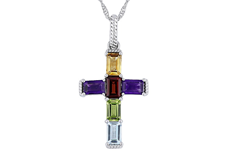 0.57ctw Rectangular Octagonal Glacier Topaz™, 0.51ct Rectangular Octagonal Manchurian Peridot™, 1.02ctw Rectangular Octagonal Amethyst, 0.59ct Vermelho Garnet™ And 0.51ct Rectangular Octagonal Citrine Rhodium Over Sterling Silver Cross Pendant With 18" Singapore Chain. Measures Approximately 1.48"L x 0.76"W. Lobster Claw Clasp. 2" Extender.
