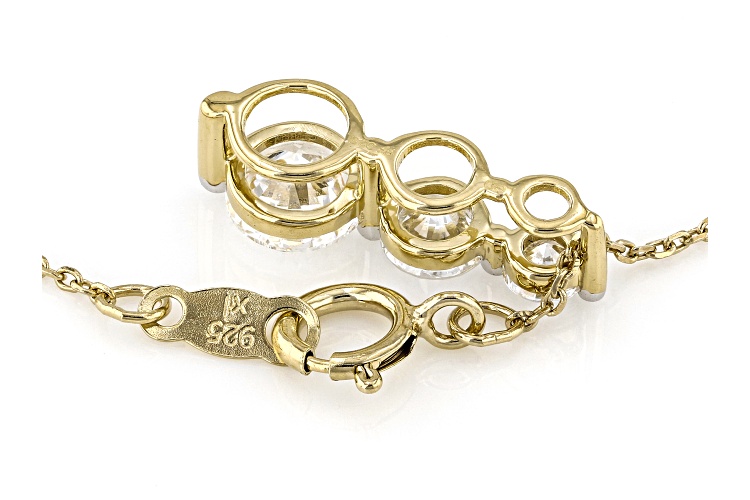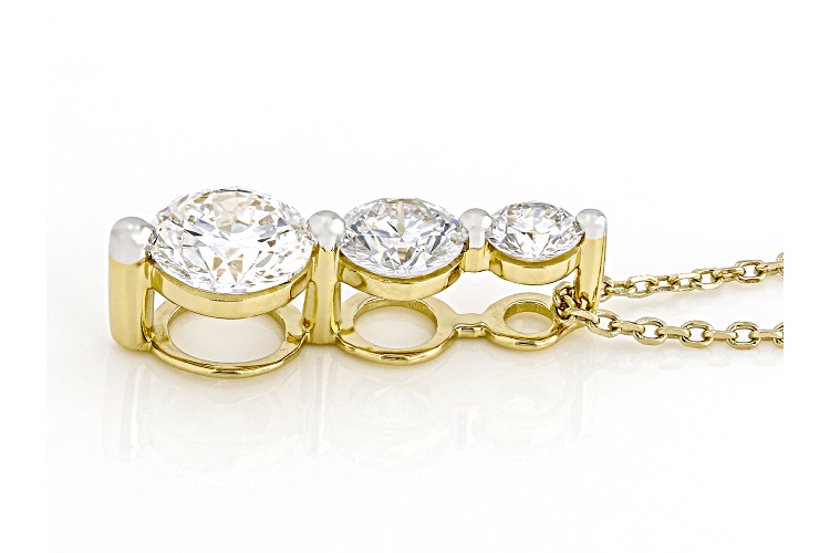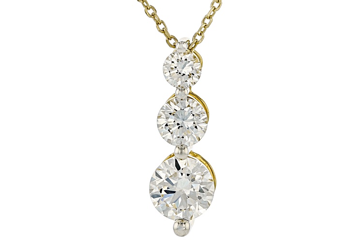 Pre-Owned Prazana® Lab-Grown Diamonds graduated slide pendant featuring 0.60ct, 0.30ct and 0.10ct round white lab-grown diamonds and crafted in 14k yellow gold over sterling silver. Suspends from an 18 inch cable chain with a spring ring clasp. Measures approximately 5/8"L x 3/16"W and has a 2.00mm bail. H color, SI1 clarity minimum. Rhodium enhanced prongs.. This product may be a customer return, vendor sample, or on-air display and is not in its originally manufactured condition. It may not be new. In some instances, these items are repackaged by JTV.