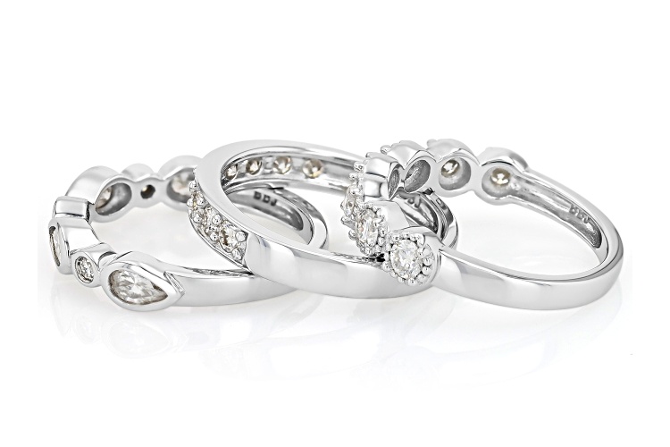 Moissanite Fire® 2.37ctw diamond equivalent weight round brilliant and pear shape, Platineve® set of three stackable band rings. Measures approximately 13/16" L x 7/16" W and is not sizeable. Actual moissanite weight is 2.13ctw.