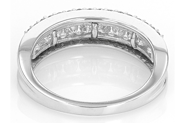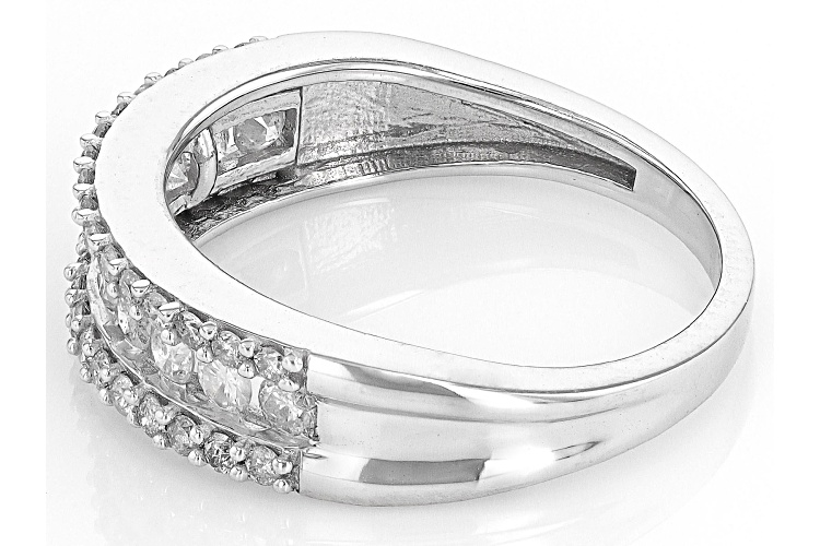 0.75ctw round white diamond, rhodium over 10k white gold band ring. Measures approximately 3/4"L x 3/16"W and is not sizeable.